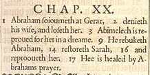 1 Abraham verweilt in Gerar, 2 lehnt seine Frau ab und verliert sie. 3 Abimelech wird ihretwegen in einem Traum getadelt. 9 Er weist Abraham zurecht, 14 gibt Sarah zurück, 16 und weist sie zurecht. 17 Er wird durch Abrahams Gebet geheilt.