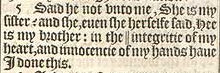 5 Sagte er nicht zu mir ‘Sie ist meine Schwester’? Und sie, sogar sie selbst sagte ‘Er ist mein Bruder’: Mit der ||Unbescholtenheit meines Herzens und der Unschuld meiner Hände tat ich dies.”[||oder: Einfältigkeit oder Aufrichtigkeit]
