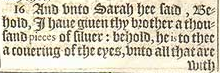 16 And vnto Sarah hee said, Behold, I haue giuen thy brother a thousand pieces of siluer: behold, he is to thee a couering of the eyes, vnto all that are with thee, and with all other: thus shee was reproued.