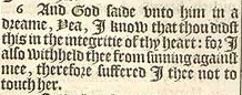 6 And God saide vnto him in a dreame, Yea, I know that thou didst this in the integritie of thy heart: for I also withheld thee from sinning against mee, therefore suffered I thee not to touch her.