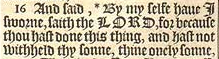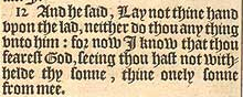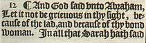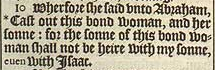 12 ¶ Und Gott sagte zu Abraham “Es soll in deinen Augen nicht schmerzlich sein, wegen des Jungen und wegen deiner Leibeigenen. Höre in allem, das Sarah zu dir gesagt hat auf ihre Stimme: Denn nach Isaak werden deine Nachkommen benannt werden.