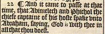 22 ¶ And it came to passe at that time, that Abimelech and Phichol the chiefe captaine of his hoste spake vnto Abraham, saying, God is with thee in all that thou doest.