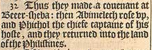 32 So machten Sie einen Bund in Beerscheba: Dann stand Abimelech auf und Pichol der Heeresführer seiner Armee und sie kehrten in das Land der Philister.