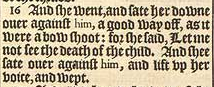 16 And she went, and sate her downe ouer against him, a good way off, as it were a bow shoot: for she said, Let me not see the death of the child. And shee sate ouer against him, and lift vp her voice, and wept.
