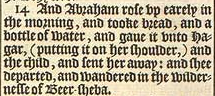 14 Und Abraham stand früh am Morgen auf und nahm Brot und eine Flasche Wasser und gab sie zu Hagar (hing es ihr über die Schulter) und dem Kind und sandte sie fort: Und sie ging fort und wanderte in der Wildnis von Beerscheba.