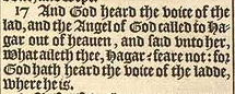17 And God heard the voice of the lad, and the Angel of God called to Hagar out of heauen, and said vnto her, What aileth thee, Hagar? feare not: for God hath heard the voice of the ladde, where he is.
