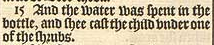 15 And the water was spent in the bottle, and shee cast the child vnder one of the shrubs.