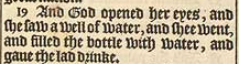 19 And God opened her eyes, and she saw a well of water, and shee went, and filled the bottle with water, and gaue the lad drinke.