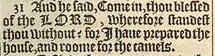 31 And he said, Come in, thou blessed of the LORD, wherefore standest thou without? for I haue prepared the house, and roome for the camels.