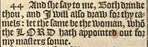 44 And she say to me, Both drinke thou, and I will also draw for thy camels: let the same be the woman, whō the LORD hath appointed out for my masters sonne.