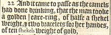 22 And it came to passe as the camels had done drinking, that the man tooke a golden || eare-ring, of halfe a shekel weight, & two bracelets for her handes, of ten shekels weight of gold, [ || Or, iewell for the forehead. ]