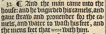 32 ¶ And the man came into the house: and he vngirded his camels, and gaue straw and prouender for the camels, and water to wash his feet, and the mens feet that were with him.