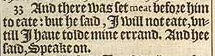 33 And there was set meat before him to eate: but he said, I will not eate, vntill I haue tolde mine errand. And hee said, Speake on.