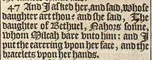 47 And I asked her, and said, whose daughter art thou? and she said, The daughter of Bethuel, Nahors sonne, whom Milcah bare vnto him: and I put the earering vpon her face, and the bracelets vpon her hands.