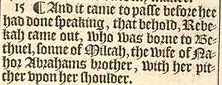15 ¶ And it came to passe before hee had done speaking, that behold, Rebekah came out, who was borne to Bethuel, sonne of Milcah, the wife of Nahor Abrahams brother, with her pitcher vpon her shoulder.