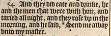54 And they did eate and drinke, he and the men that were with him, and taried all night, and they rose vp in the morning, and he said, *Send me away vnto my master.[ * Vers. 56. and 59. ]