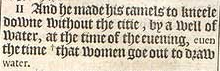 11 And he made his camels to kneele downe without the citie, by a well of water, at the time of the euening, euen the time +that women goe out to draw water. [ + Hebr. that wom which draw water, goe foorth. ]
