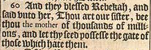 60 And they blessed Rebekah, and said vnto her, Thou art our sister, bee thou the mother of thousands of millions, and let thy seed possesse the gate of those which hate them.