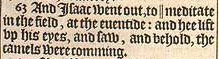 63 And Isaac went out, to || meditate in the field, at the euentide: and hee lift vp his eyes, and saw, and behold, the camels were comming. [ || Or, to pray. ]