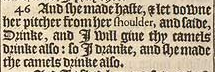 46 And she made haste, & let downe her pitcher from her shoulder, and saide, Drinke, and I will giue thy camels drinke also: so I dranke, and she made the camels drinke also.
