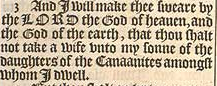 3 And I will make thee sweare by the LORD the God of heauen, and the God of the earth, that thou shalt not take a wife vnto my sonne of the daughters of the Canaanites amongst whom I dwell.