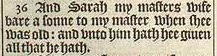 36 And Sarah my masters wife bare a sonne to my master when shee was old: and vnto him hath hee giuen all that he hath.