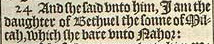 24 And she said vnto him, I am the daughter of Bethuel the sonne of Milcah, which she bare vnto Nahor: