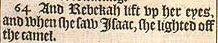 64 And Rebekah lift vp her eyes, and when she saw Isaac, she lighted off the camel.