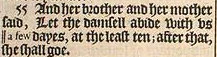 55 And her brother and her mother said, Let the damsell abide with vs || a few dayes, at the least ten; after that, she shall goe. [ || Or, a full yeere, or, ten moneths. ]