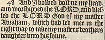 48 And I bowed downe my head, and worshipped the LORD, and blessed the LORD God of my master Abraham, which had led mee in the right way to take my masters brothers daughter vnto his sonne.