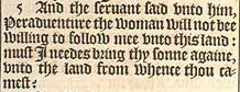 5 And the seruant said vnto him, Peraduenture the woman will not bee willing to follow mee vnto this land: must I needes bring thy sonne againe, vnto the land from whence thou camest?
