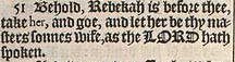 51 Behold, Rebekah is before thee, take her, and goe, and let her be thy masters sonnes wife, as the LORD hath spoken.