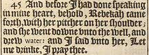45 And before I had done speaking in mine heart, behold, Rebekah came forth, with her pitcher on her shoulder; and she went downe vnto the well, and drew water: and I said vnto her, Let me drinke, I pray thee.