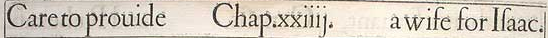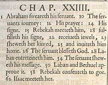 1 Abraham beschwört seine Diener. 10 Die Reise der Diener: 12 Sein Gebet: 14 Sein Zeichen. 15 Rebekka trifft ihn, 18 erfüllt sein Zeichen, 22 erhält Juwelen, 23 zeigt ihre Verwandschaft, 25 und lädt ihn nach Hause ein. 26 Der Diener preist Gott. 28 Laban unterhält ihn. 34 Der Diener zeigt seine Botschaft. 50 Laban und Bethel bestätigen sie. 58 Rebekka willigt ein zu gehen. 62 Isaak trifft sie.