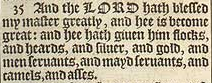 35 And the LORD hath blessed my master greatly, and hee is become great: and hee hath giuen him flocks, and heards, and siluer, and gold, and men seruants, and mayd seruants, and camels, and asses.