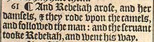 61 ¶ And Rebekah arose, and her damsels, & they rode vpon the camels, and followed the man: and the seruant tooke Rebekah, and went his way.
