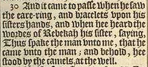 30 And it came to passe when he saw the eare-ring, and bracelets vpon his sisters hands, and when hee heard the wordes of Rebekah his sister, saying, Thus spake the man vnto me, that he came vnto the man; and behold, hee stood by the camels, at the well.