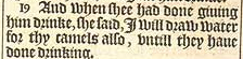 19 And when shee had done giuing him drinke, she said, I will draw water for thy camels also, vntill they haue done drinking.