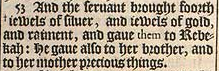 53 And the seruant brought foorth +iewels of siluer, and iewels of gold, and raiment, and gaue them to Rebekah: He gaue also to her brother, and to her mother precious things. [+Hebr.: Hebr. vessels.]