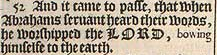 52 And it came to passe, that when Abrahams seruant heard their words, he worshipped the LORD, bowing himselfe to the earth.