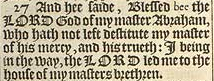 27 And hee saide, Blessed bee the LORD God of my master Abraham, who hath not left destitute my master of his mercy, and his trueth: I being in the way, the LORD led me to the house of my masters brethren.