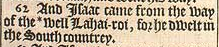 62 And Isaac came from the way of the *well Lahai-roi, for he dwelt in the South countrey.[ *Chap. 16. 14. and 25. 11. ]
