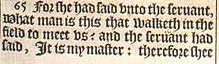65 For she had said vnto the seruant, What man is this that walketh in the field to meet vs? and the seruant had said, It is my master: therefore shee tooke a vaile and couered her selfe.