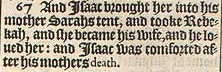 67 Und Isaak brachte sie zu, Zelt seiner Mutter Sarah und nahm Rebekka und sie wurde seine Frau und er liebte sie: Und Isaak war nach dem Tod seiner Mutter getröstet.