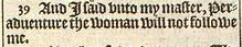 39 And I said vnto my master, Peraduenture the woman will not followe me.