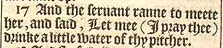 17 And the seruant ranne to meete her, and said, Let mee (I pray thee) drinke a little water of thy pitcher.