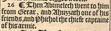 26 ¶ Then Abimelech went to him from Gerar, and Ahuzzath one of his friends, and Phichol the chiefe captaine of his armie.