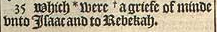 35 Which * were +a griefe of minde vnto Isaac and to Rebekah. [ *Chap. 27. 46. , Hebr. +bitternesse of spirit. ]