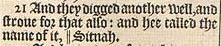 21 And they digged another well, and stroue for that also: and hee called the name of it, || Sitnah. [ || That is, Hatred. ]