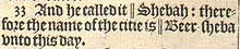 33 And he called it || Shebah: therefore the name of the citie is || Beer-sheba vnto this day. [ || That is, an oath. , ||That is, the well of the oath. ]